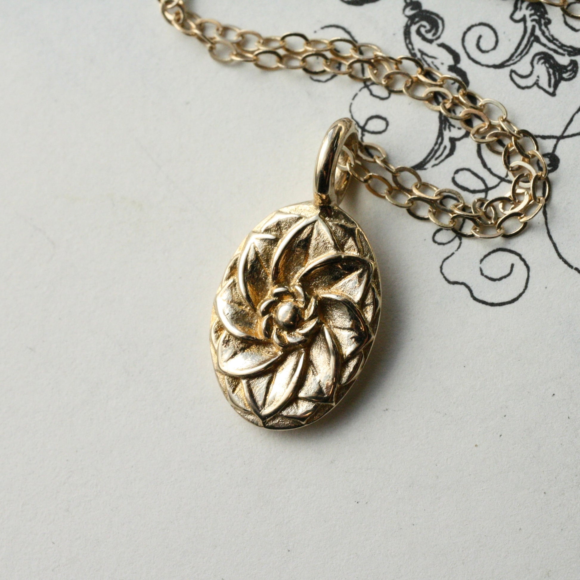 A solid 14k gold rosette charm. does not come with a chain, ready to ship.