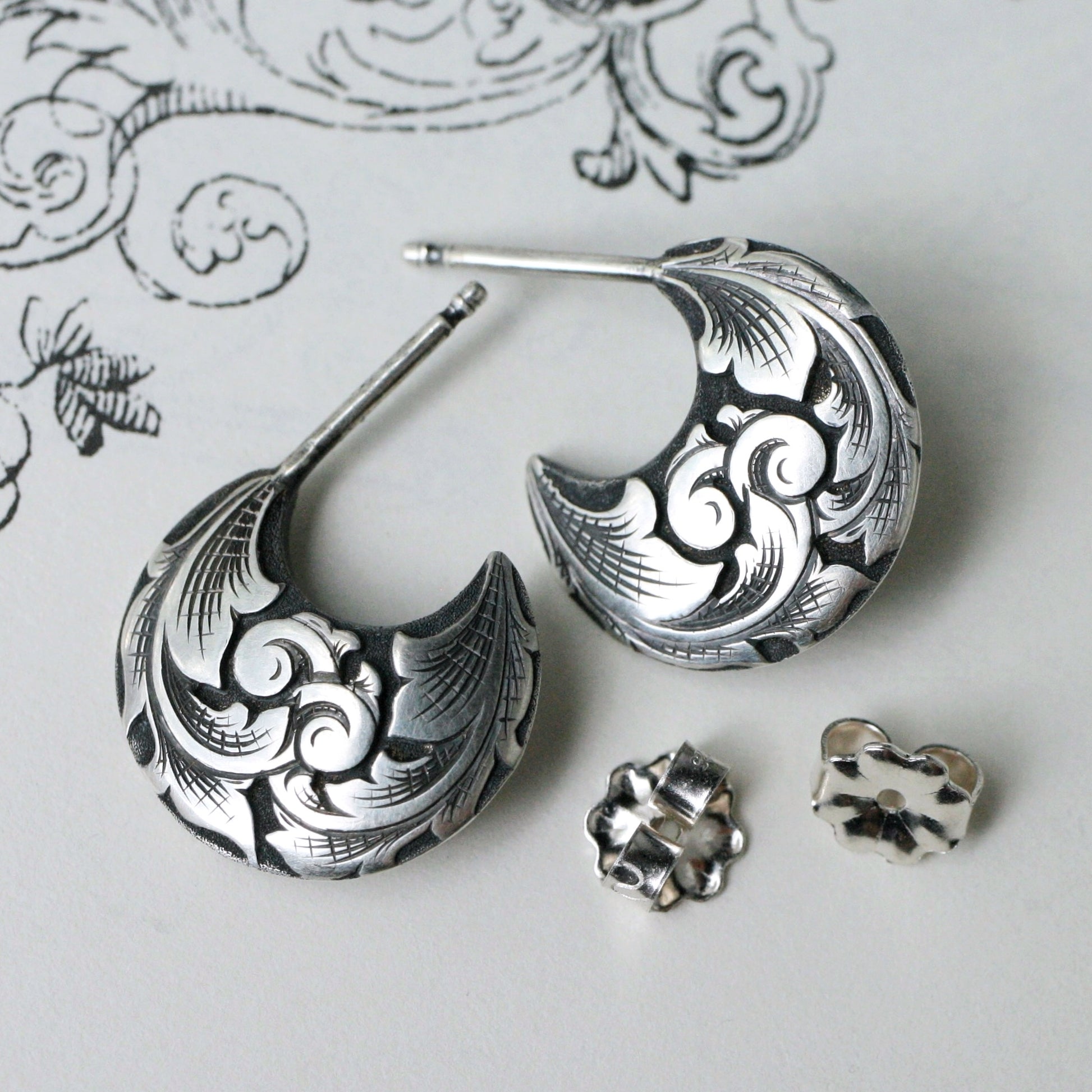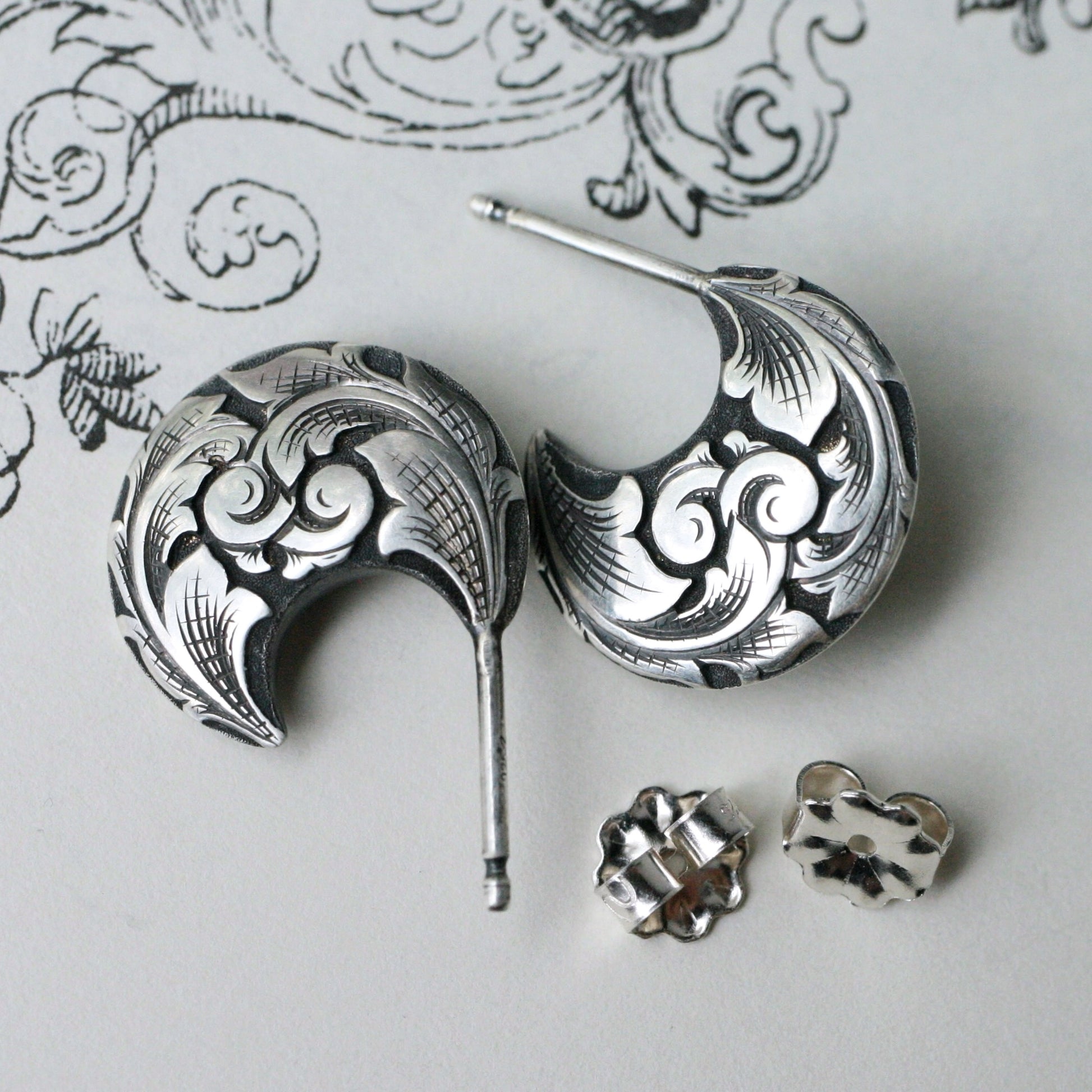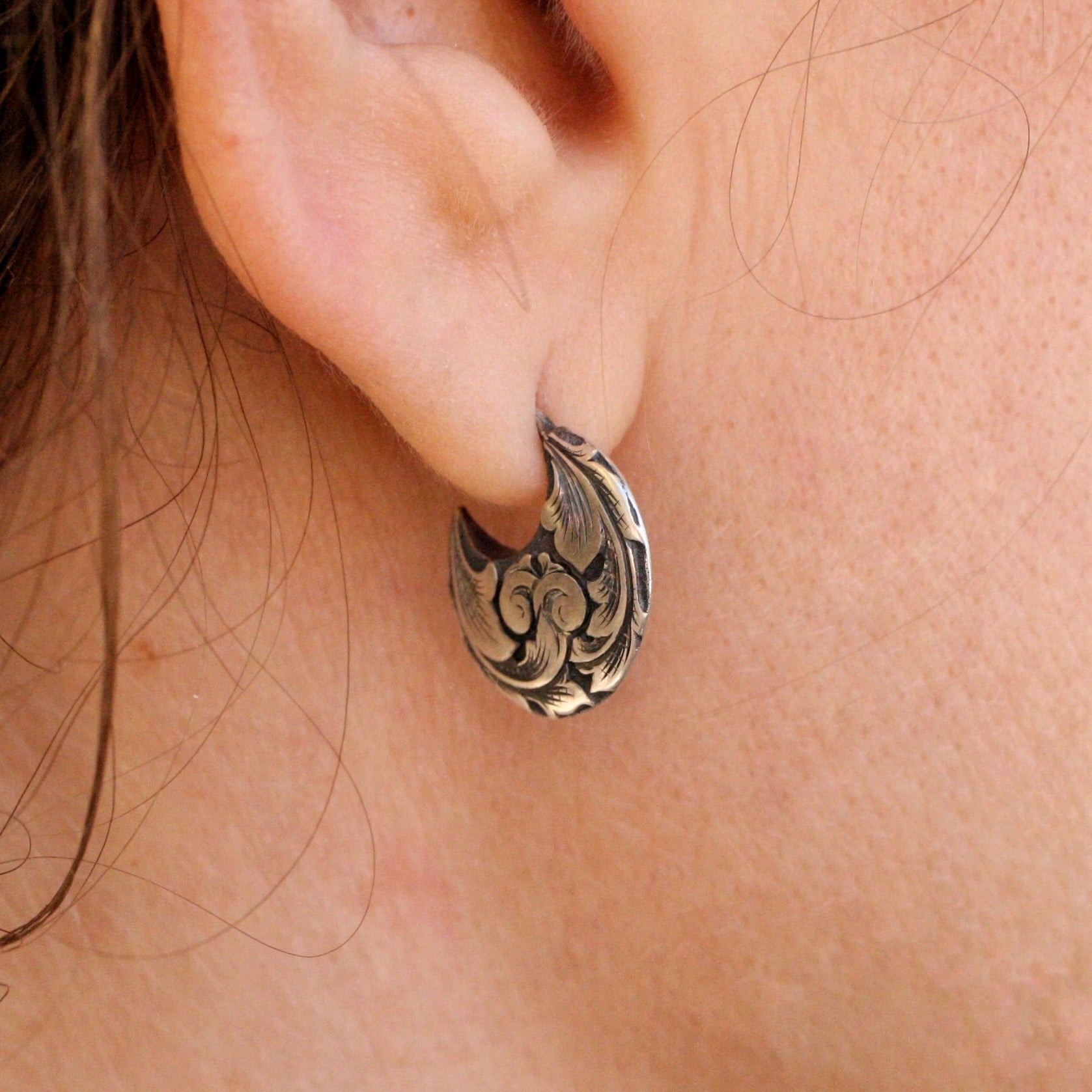 These solid but lightweight earrings are perfect for everyday wear. Carved in deep-relief and hand engraved on each side. These earrings measure roughly 14.5 millimeters from top to bottom, available made-to-order in oxidized sterling silver or 14k gold. Please see This Listing for two-tone options.