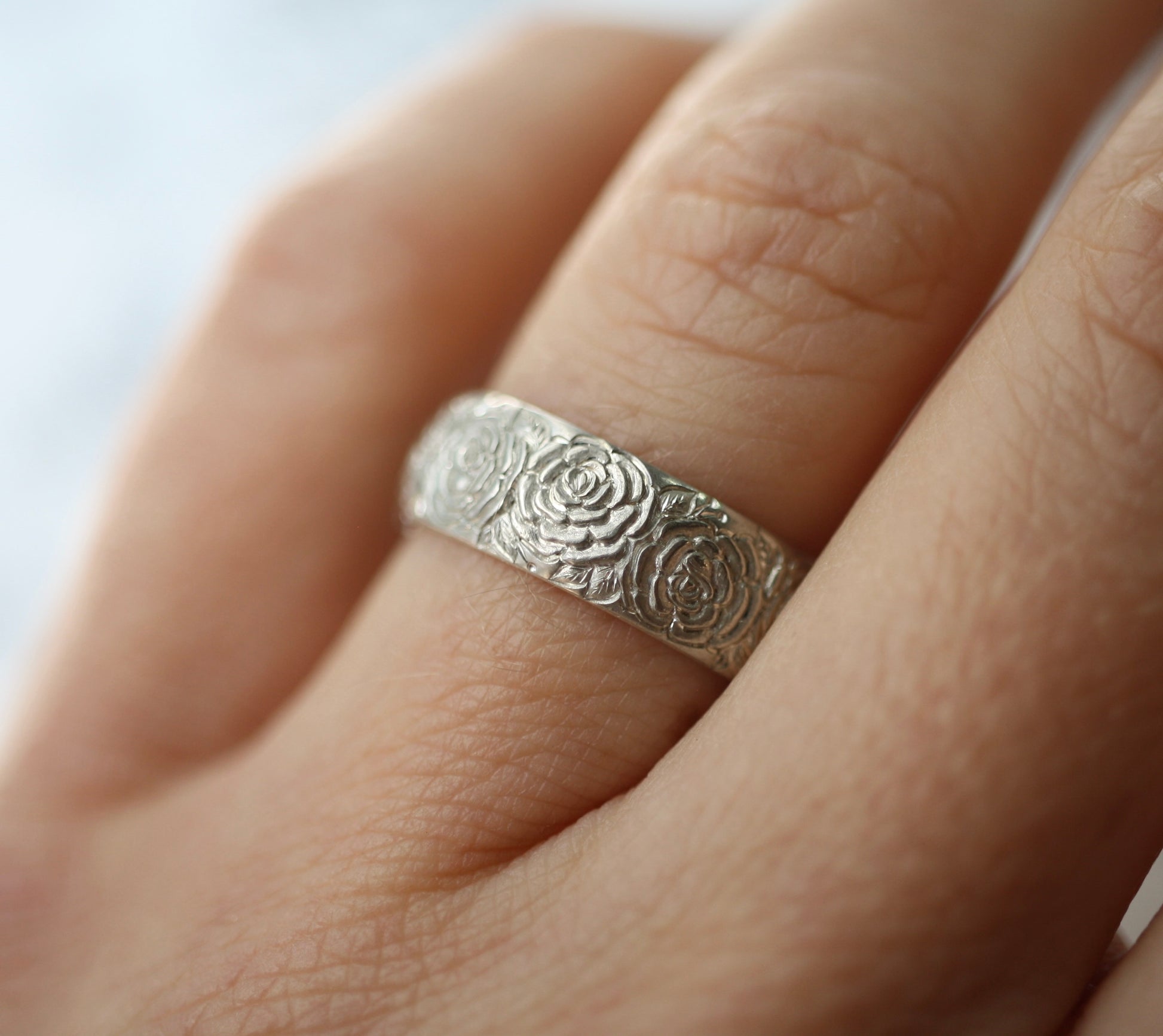 Blooming roses surround this 6mm wide band. Made to order in solid sterling silver or 14k gold with hand engraved details.