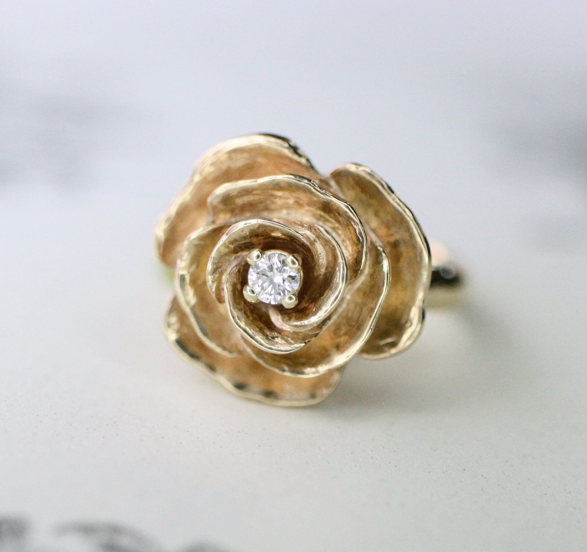 This fun vintage style rose ring is made in 14k gold and features a 2.8mm fair mined Canadian diamond. The flower measures roughly 16mm wide by 15mm tall. The band is 2.5mm thick. Made to order in solid sterling silver or 14k gold.