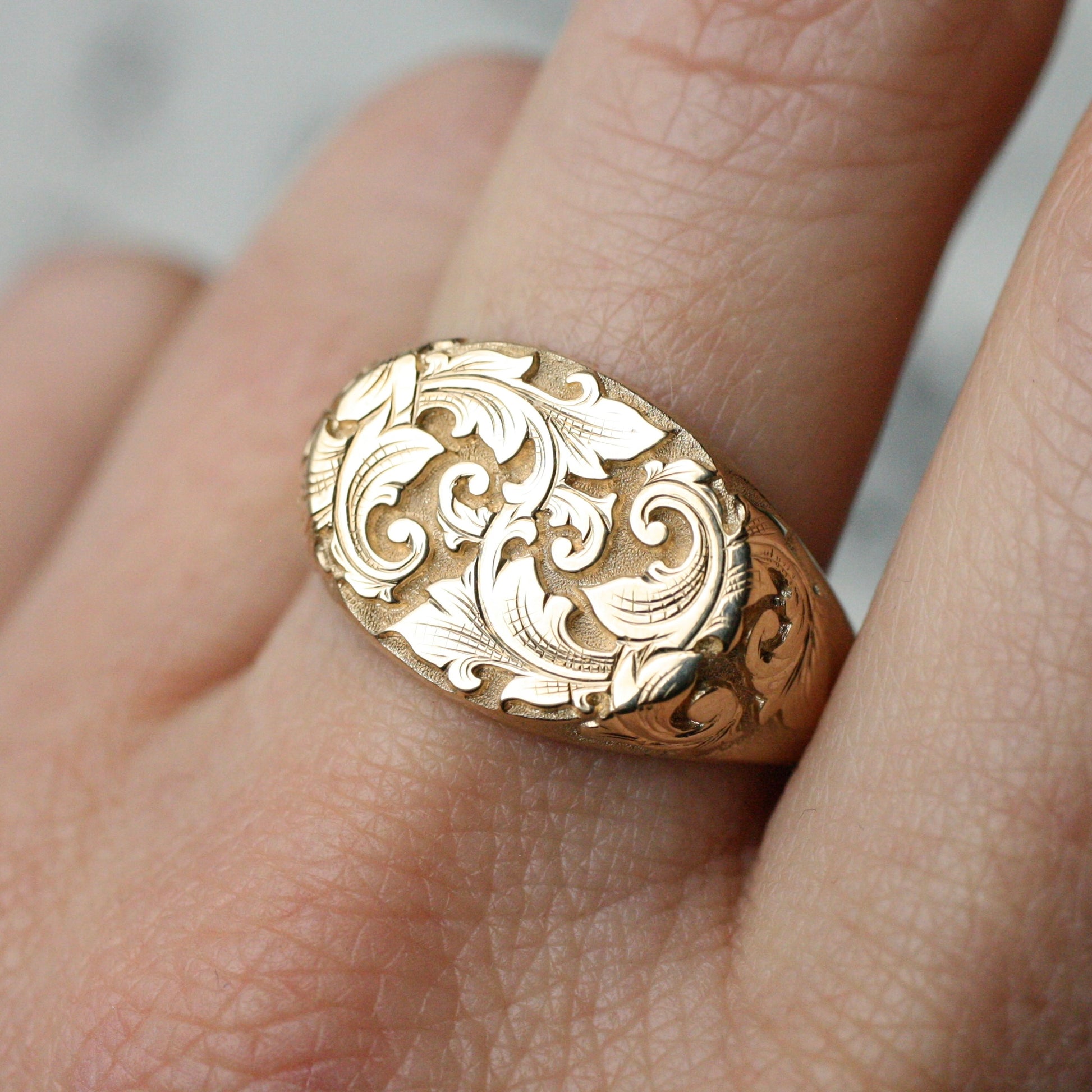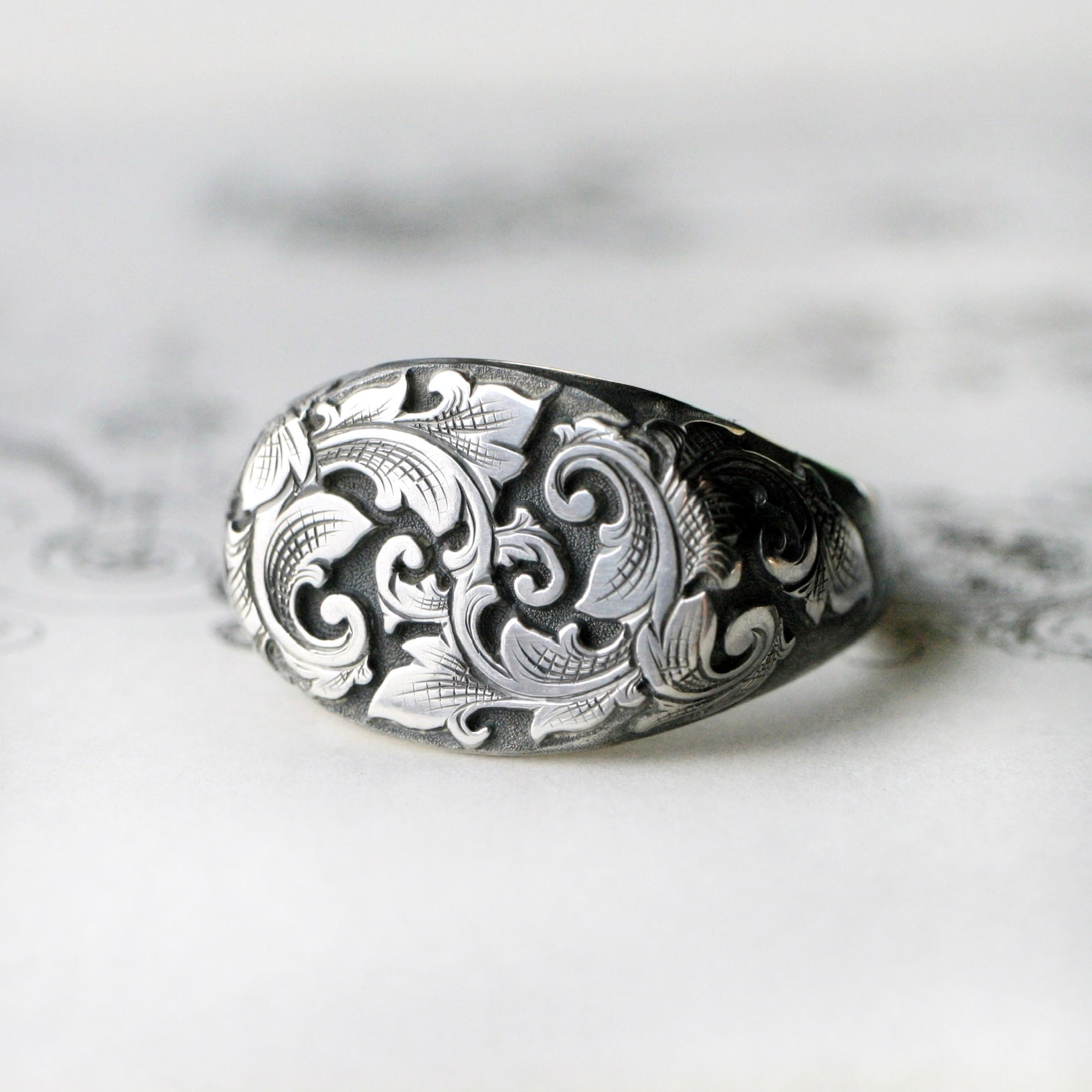 This elegant signet ring is fully engraved in deep relief with acanthus leaves and scrolls. The face measures 17mm wide by 13mm tall. Made to order in sterling silver with oxidized background or solid 14k gold. Please see other listing for two-tone options.