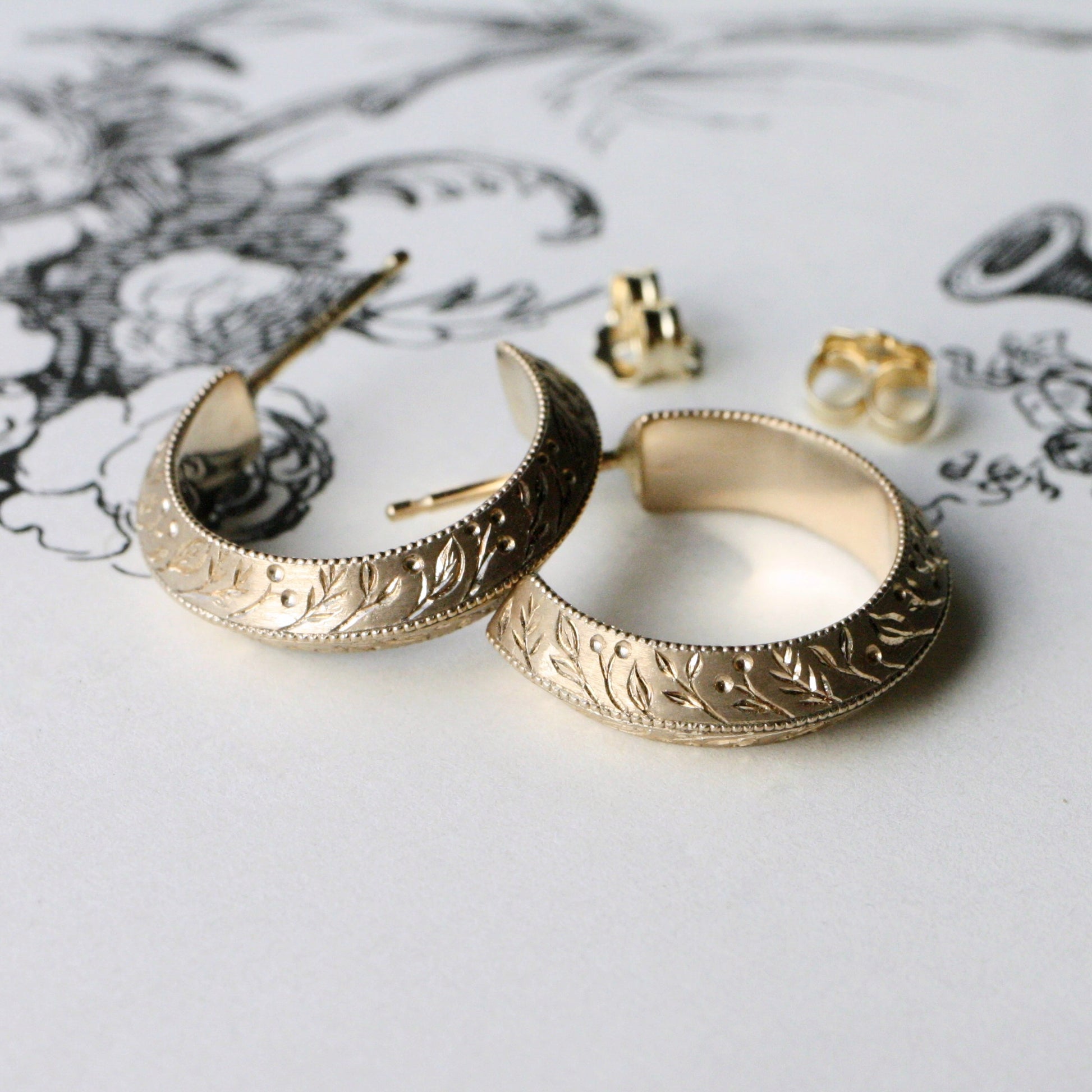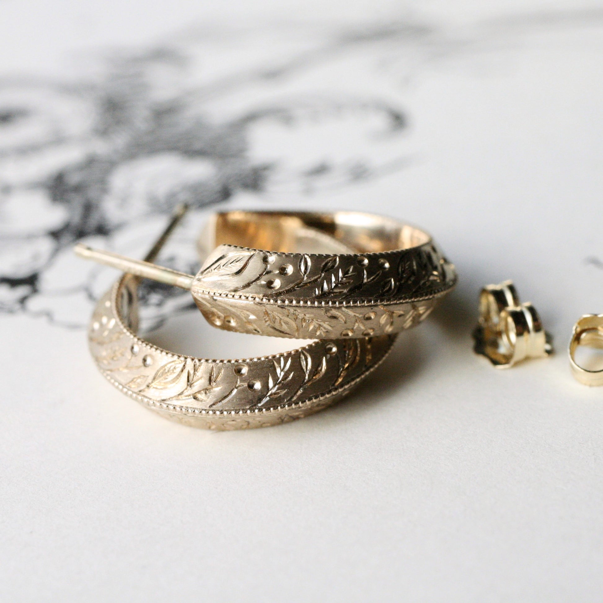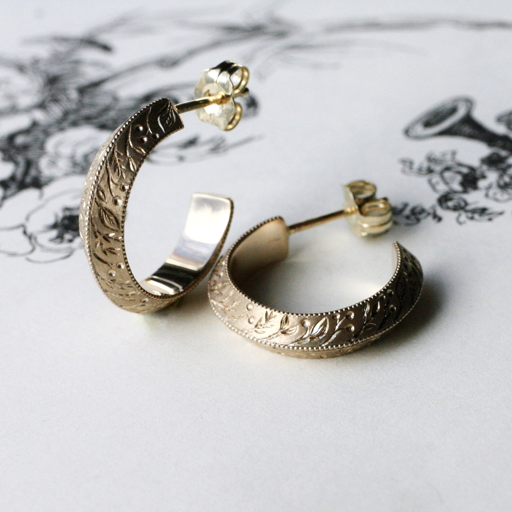 These lightweight and easy to wear hoops are hand engraved with a garden motif and millgrain details. Made to order in solid sterling silver or 14k gold, they measure 16mm from top to bottom and 4.25mm wide.