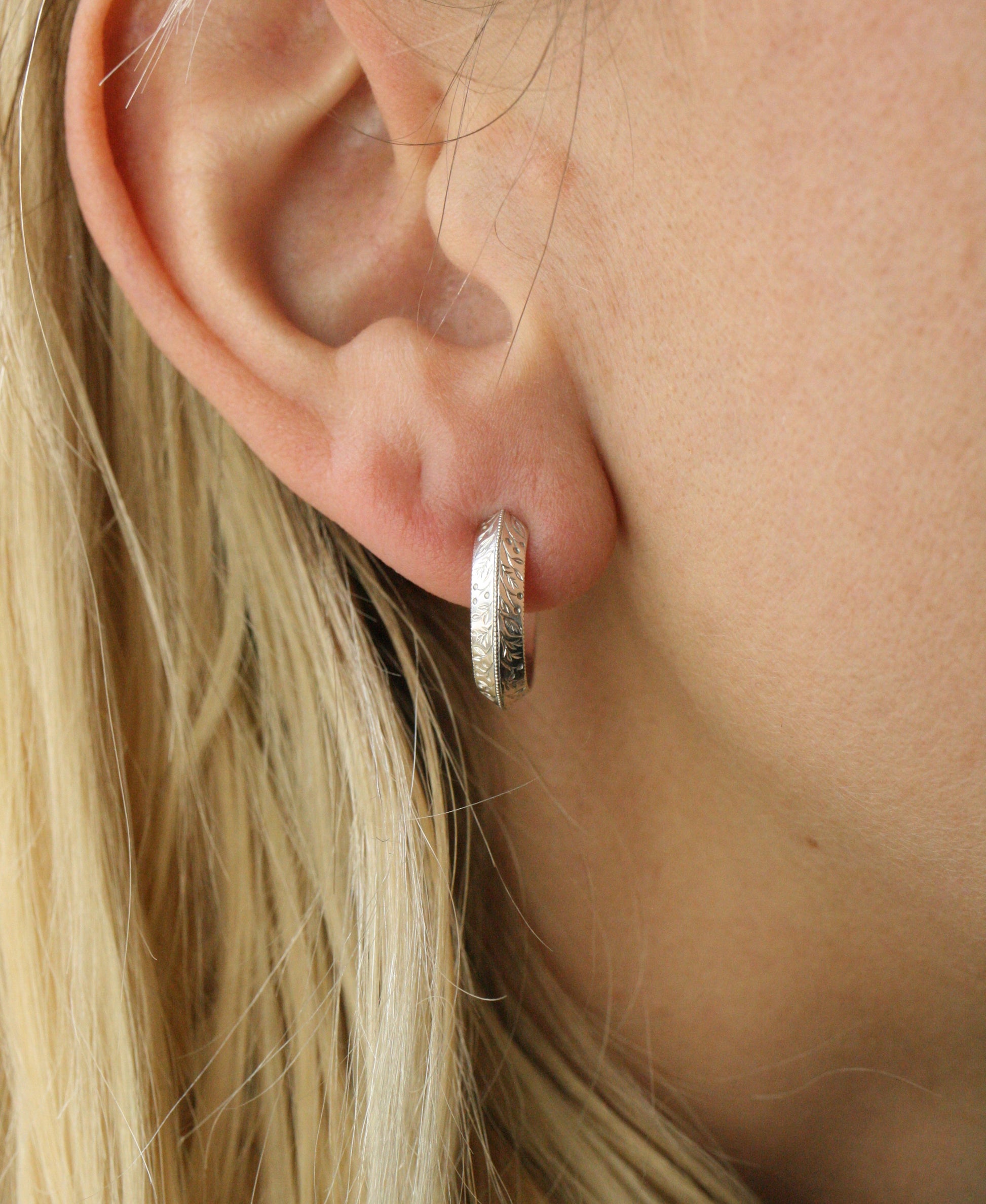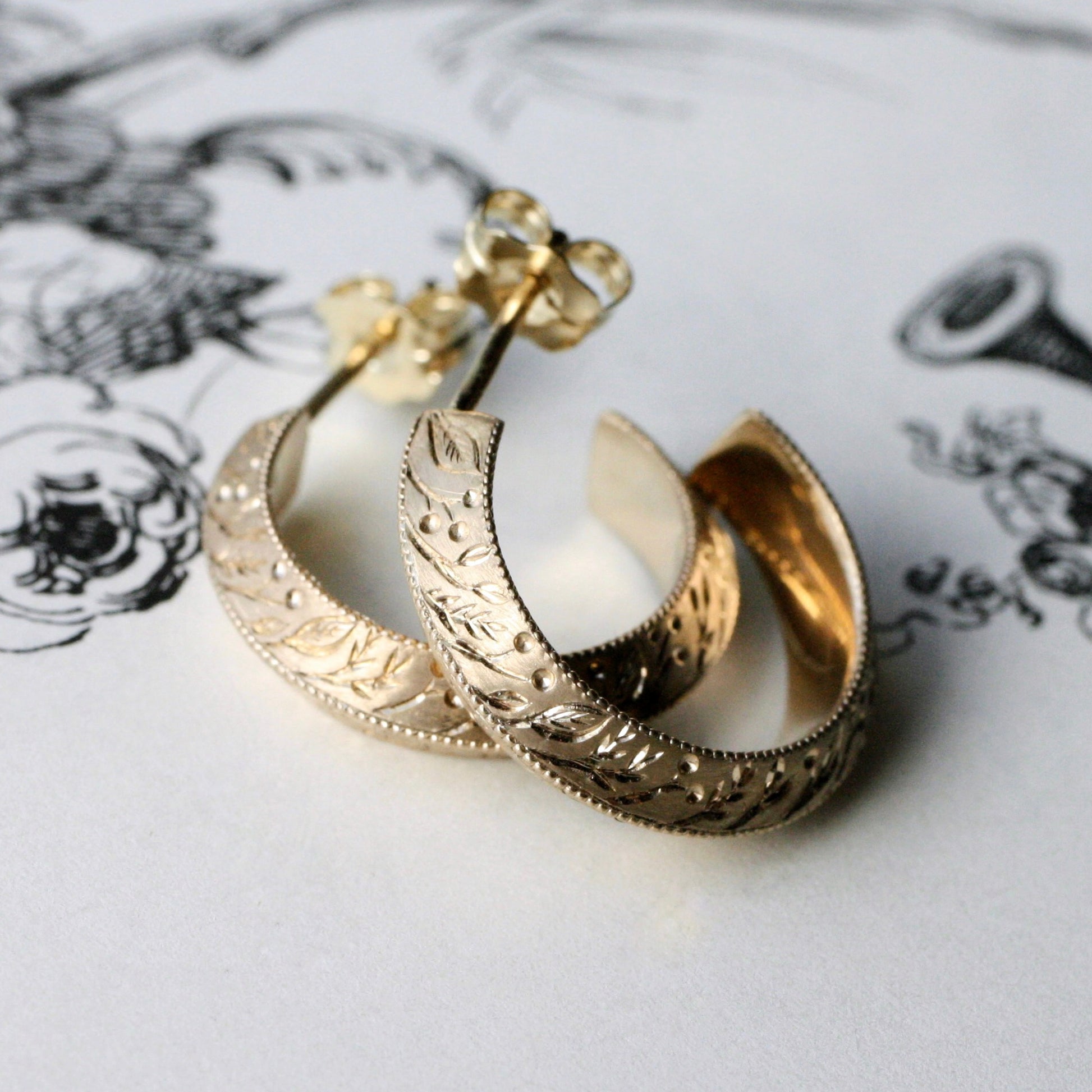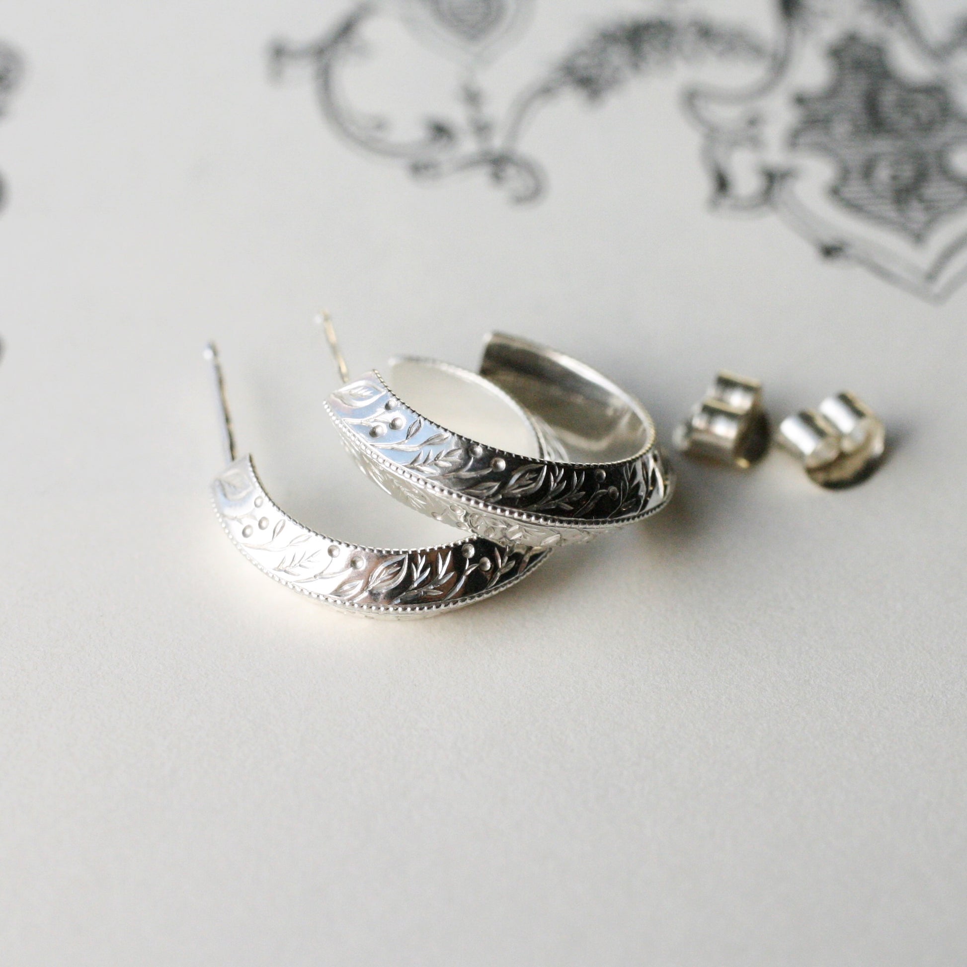 These lightweight and easy to wear hoops are hand engraved with a garden motif and millgrain details. Made to order in solid sterling silver or 14k gold, they measure 16mm from top to bottom and 4.25mm wide.