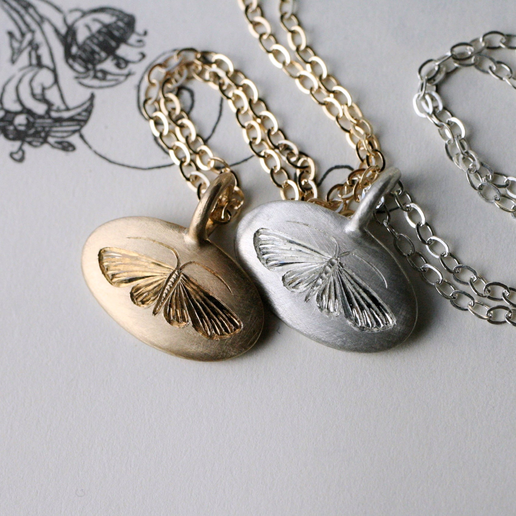 Catch the light with this playful house moth pendant. Hand engraved in sterling silver or 14k gold, 14mm wide by 12mm tall including bail. Comes on a 16", 18" or 20" sterling silver or 14k gold 1.3mm flat cable chain. Also available without a chain. Made to order.