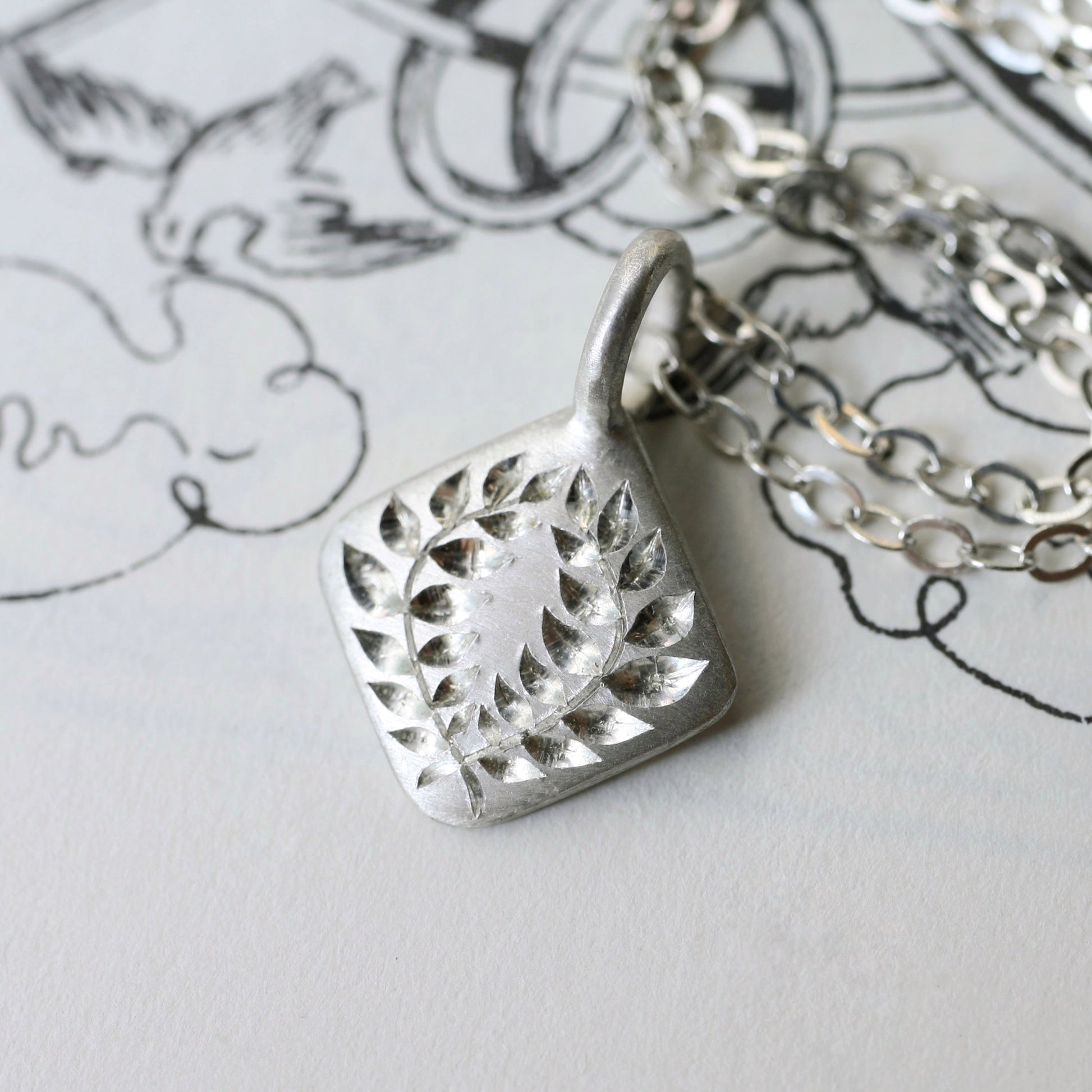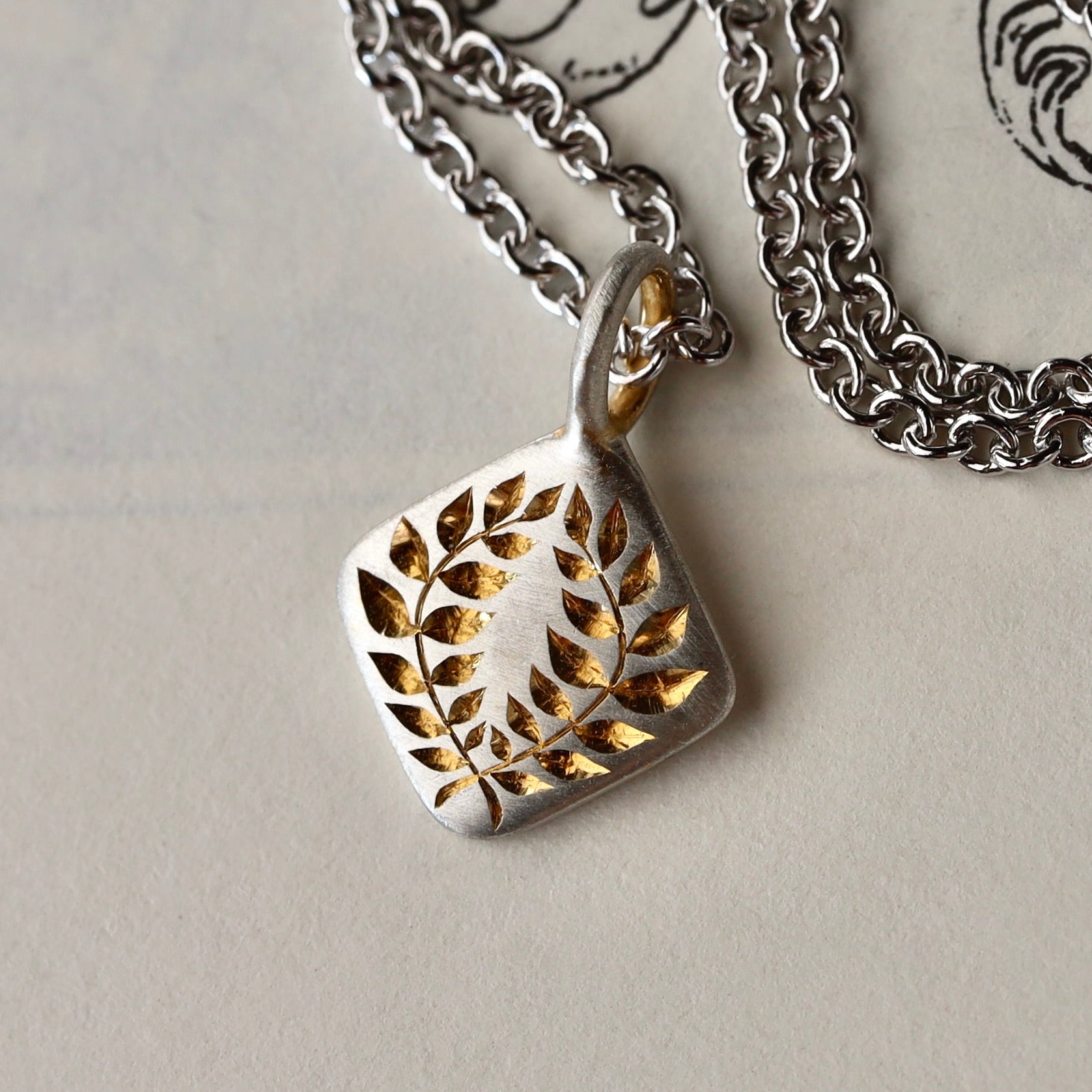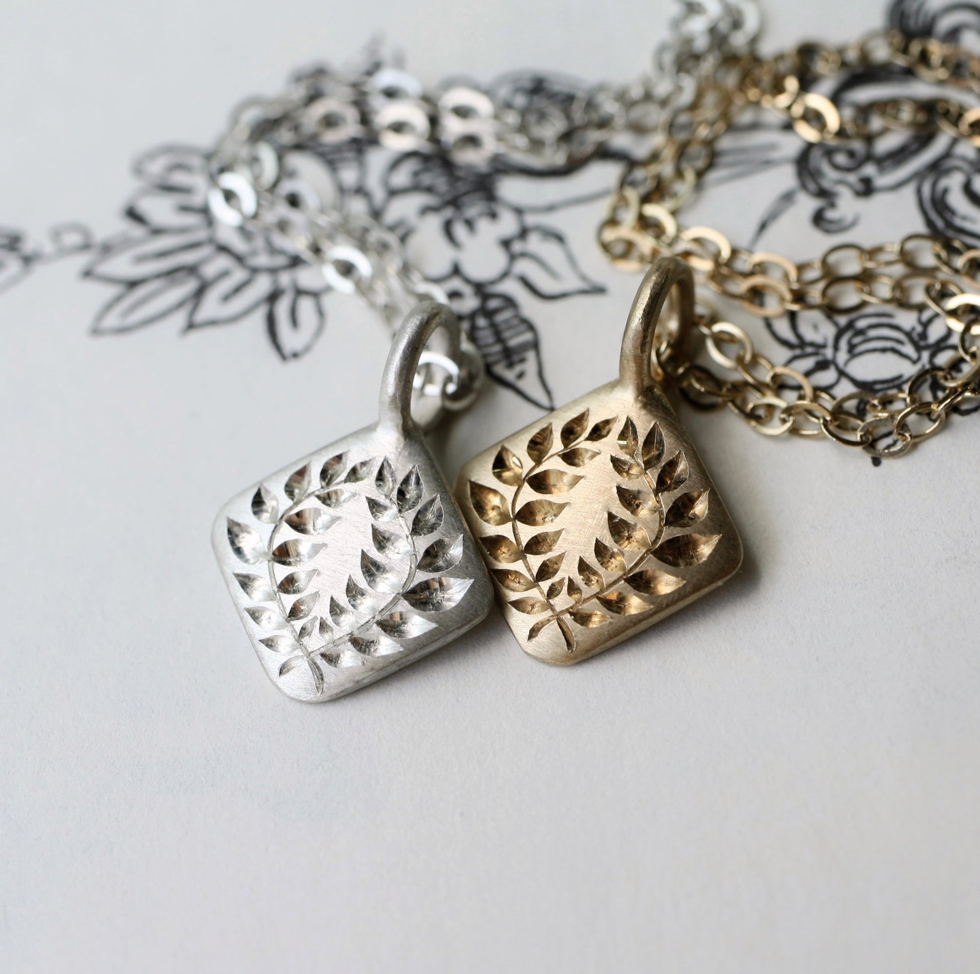 Laurel is an ancient symbol of victory. Wear this pendant as a recognition of your greatest achievements. 5mm wide by 15 including bail. Made to order in solid sterling silver or 14k gold with hand engraved details. Comes on a 16", 18" or 20" sterling silver or 14k gold 1.3mm flat cable chain. Also available without a chain.