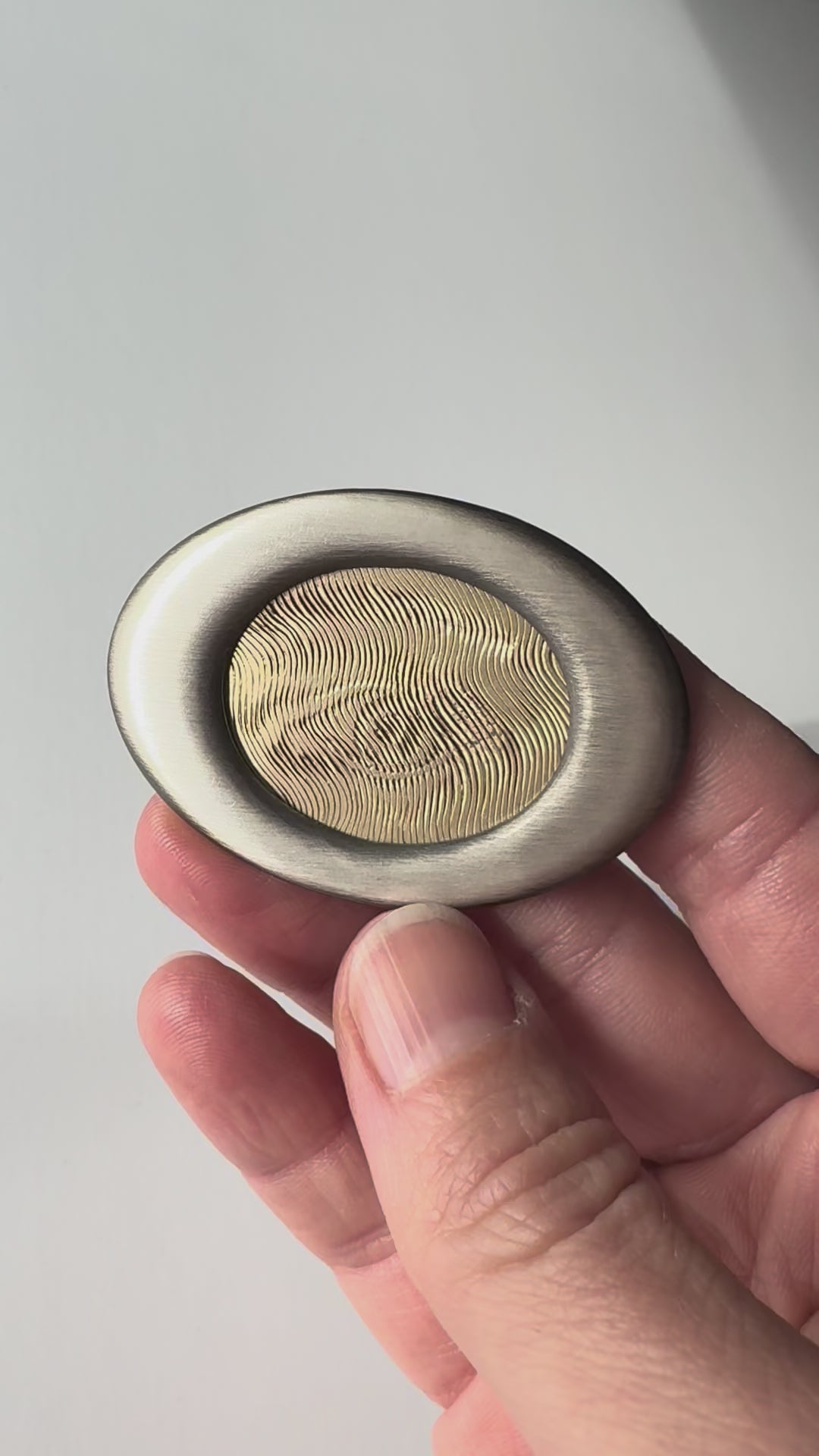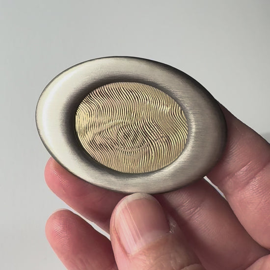 A truly one of a kind optical illusion lovers eye brooch! Hand fabricated sterling silver and hand engraved 14k gold. Encased in a hand fabricated sterling silver frame, this 14k gold, halftone, hand-engraved, psychedelic, all knowing eye appears sharp at some angles and blurred by reflecting light at others. This brooch measures just under 2 inches wide and 1 4/8 inches tall. Sterling silver, 14k gold, stainless steel. This piece was created in 2014 for a makers competition at Fiat Lux in San Fransisco.