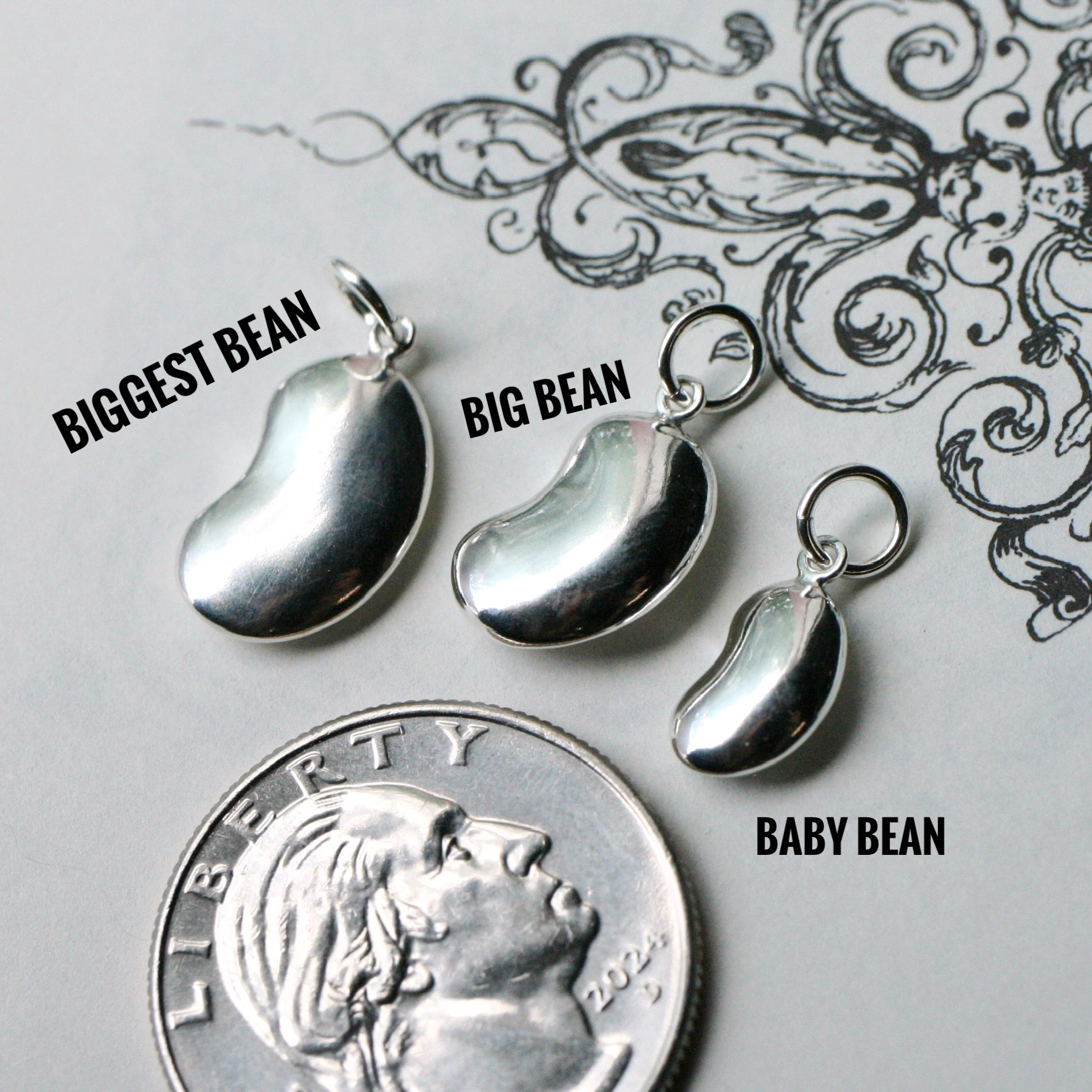 Available in sterling silver or 14k gold, the Baby Bean measures 6.5 x 10 millimeters and 3.25mm thick, the Big Bean measures 9.25 x 13.25 millimeters and 4mm thick, and the Biggest Bean measures 9.6 x 15 millimeters and 2.8mm thick. All three sizes are completely solid, not hollow and are available with a matching silver or 14k gold 16”, 18” or 20” 1.3mm flat cable chain. These beans are not karat stamped but the chains are. Want more than one bean on a single chain? Just add one bean with a chain to your cart and then separately add more beans and I'll put them all on the same necklace.