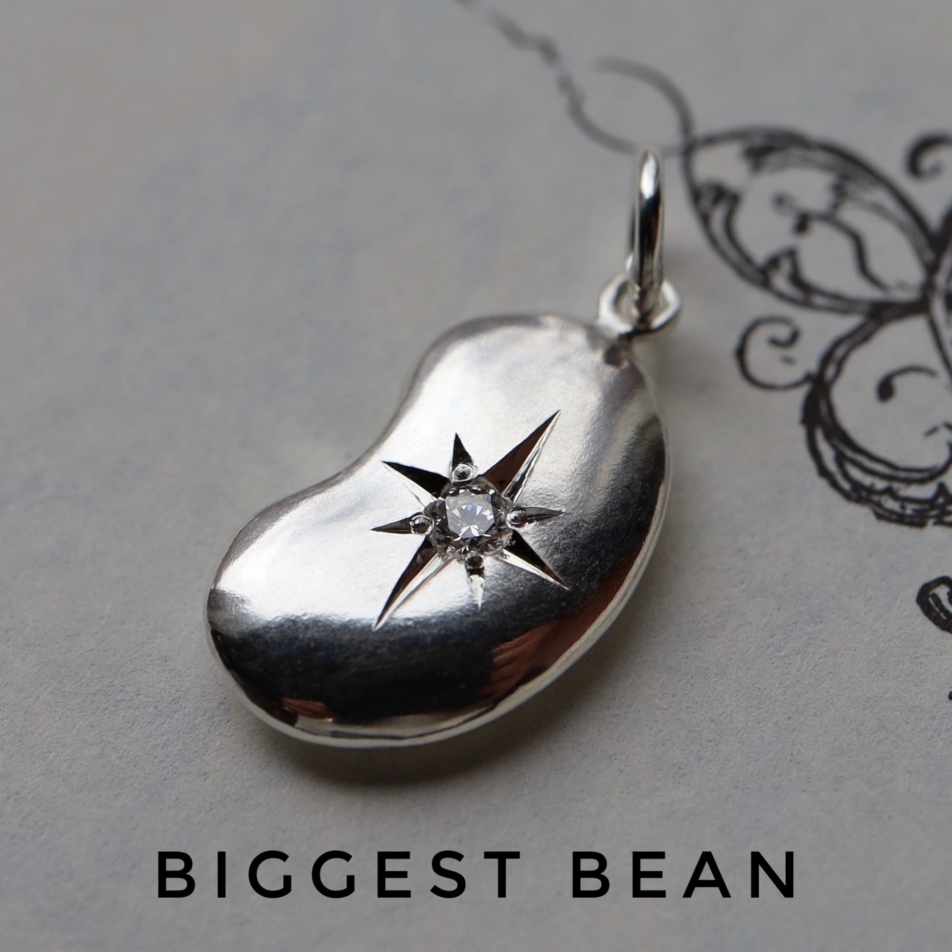 Available in sterling silver or 14k gold, the Baby Bean measures 6.5 x 10 millimeters, 3.25mm thick, and set with a 2 millimeter natural Canadian diamond. The Biggest Bean measures 9.6 x 15 millimeters and 2.8mm thick, and is set with a 2.5 millimeter natural Canadian diamond. Both sizes are completely solid, not hollow and are available with a matching silver or 14k gold 16”, 18” or 20” 1.3mm flat cable chain. These beans are not karat stamped but the chains are.