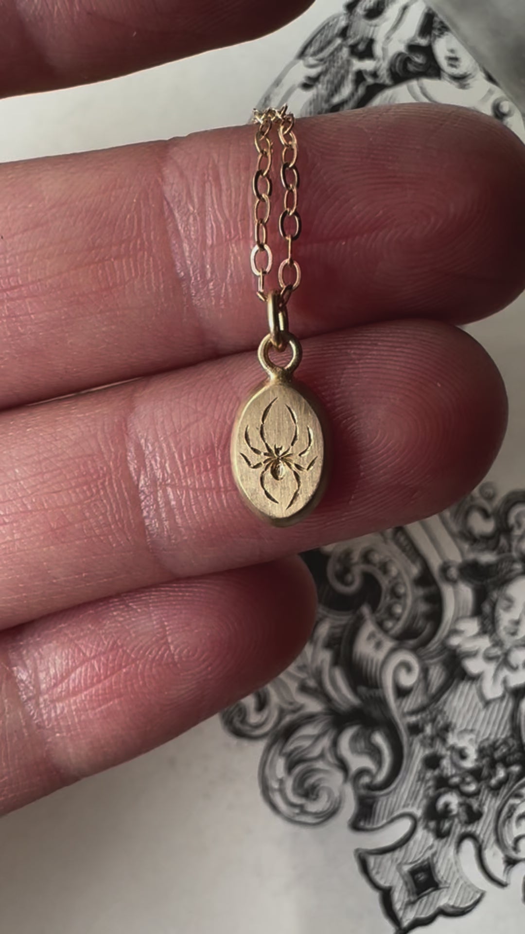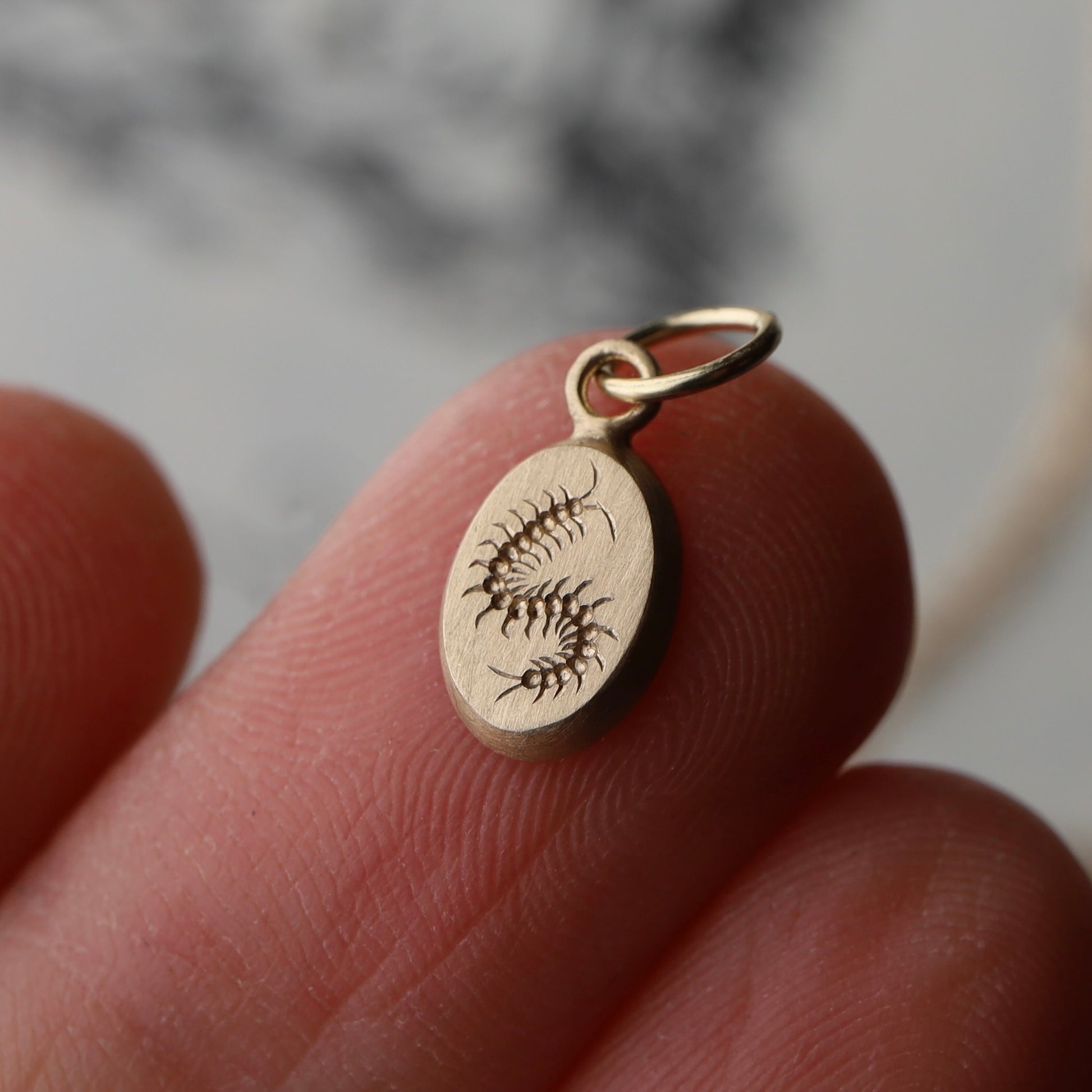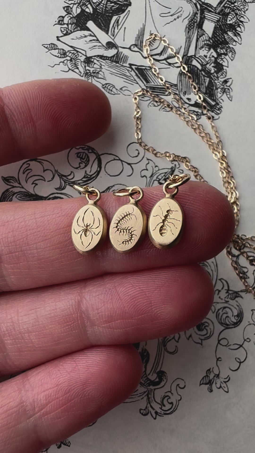 An itty bitty spider, Ant or Centipede pendant, hand engraved in solid 14k gold. Pendant measures roughly 6 by 11 millimeters including the bail. Available with or without a 16, 18 or 20 inch 14k gold chain. Made-to-order.