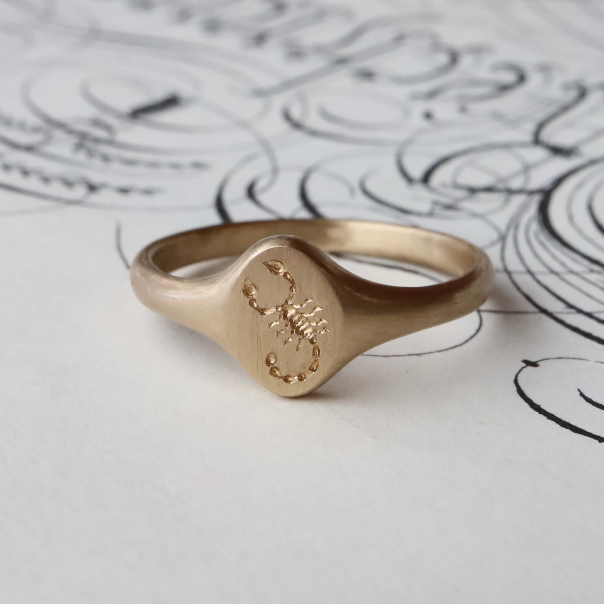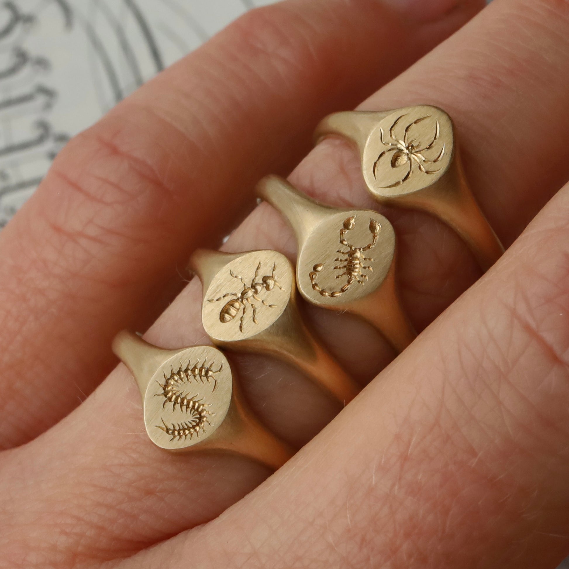An itty bitty spider, ant, Scorpion or centipede signet, hand engraved in solid 14k gold. Face of the ring measures roughly 8 x 6 millimeters. Made-to-order.