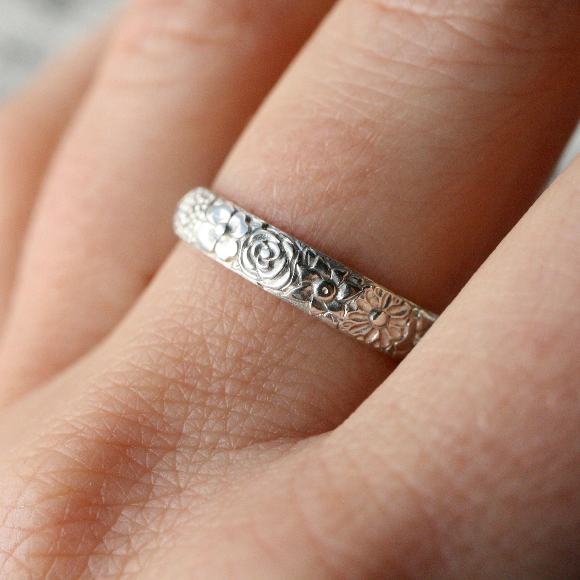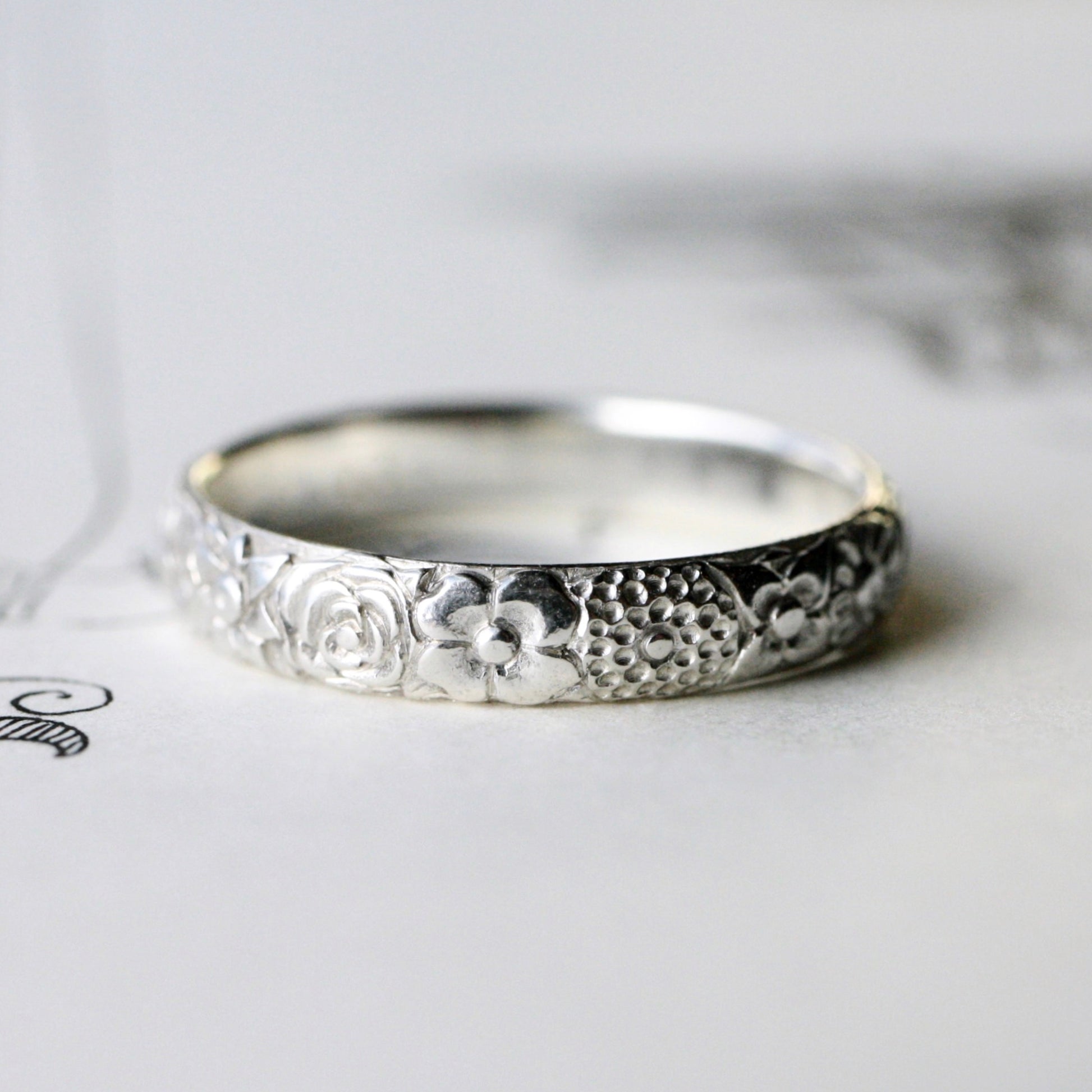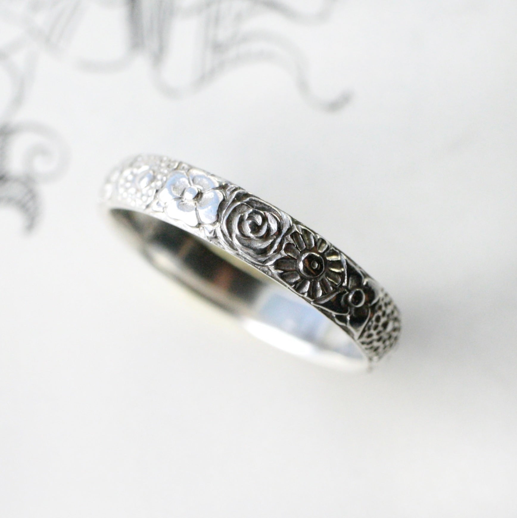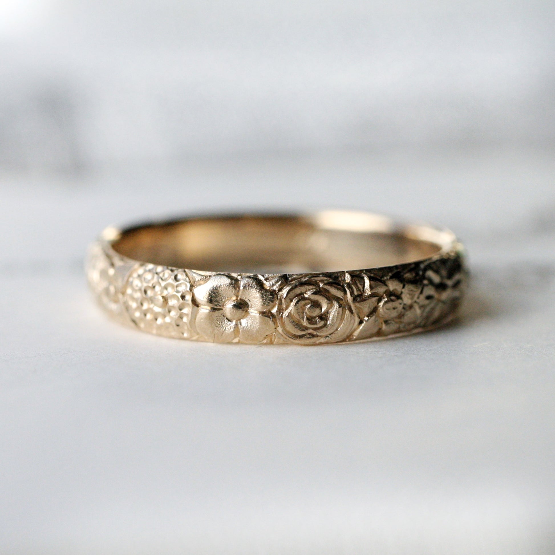 Named after one of my favorite childhood movies, the secret garden band is dainty yet elaborately decorated with a variety of flowers. Simple yet sure to stand out and easily stackable. 3.5mm wide, made to order in solid sterling silver or 14k gold with hand engraved details.
