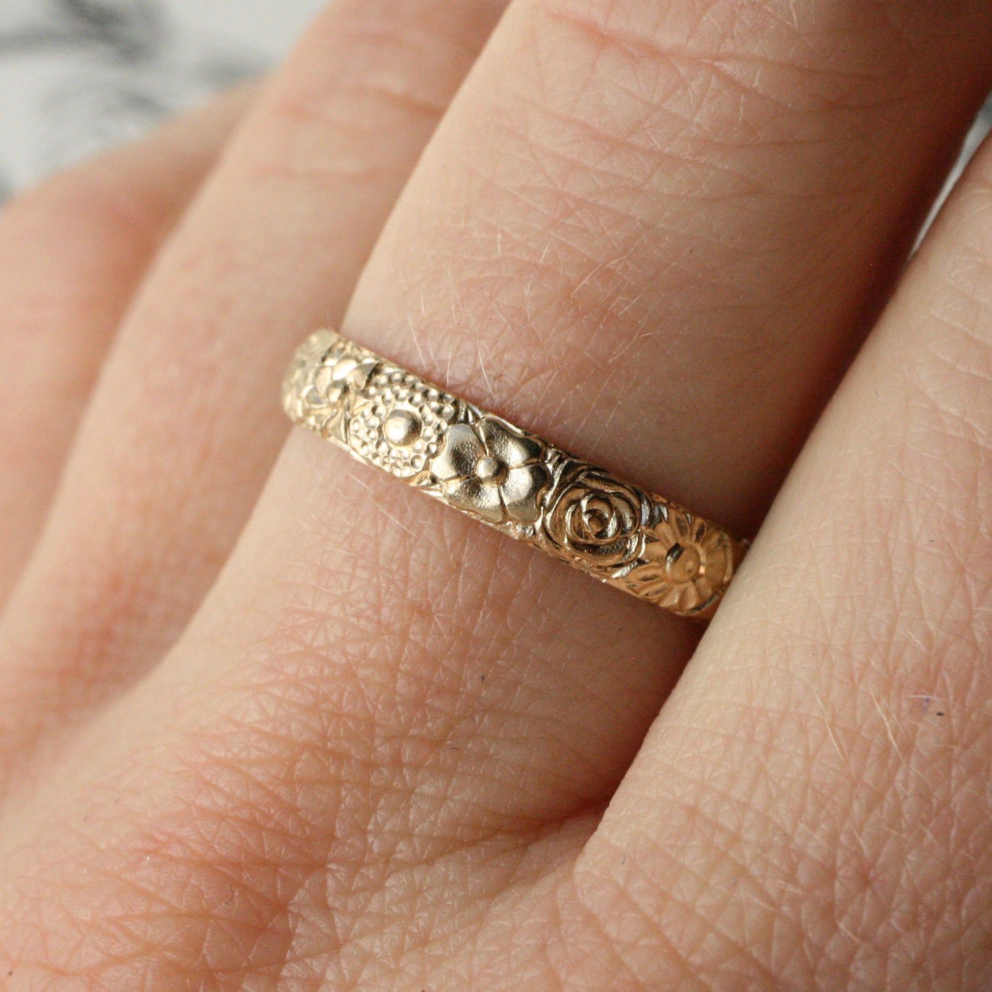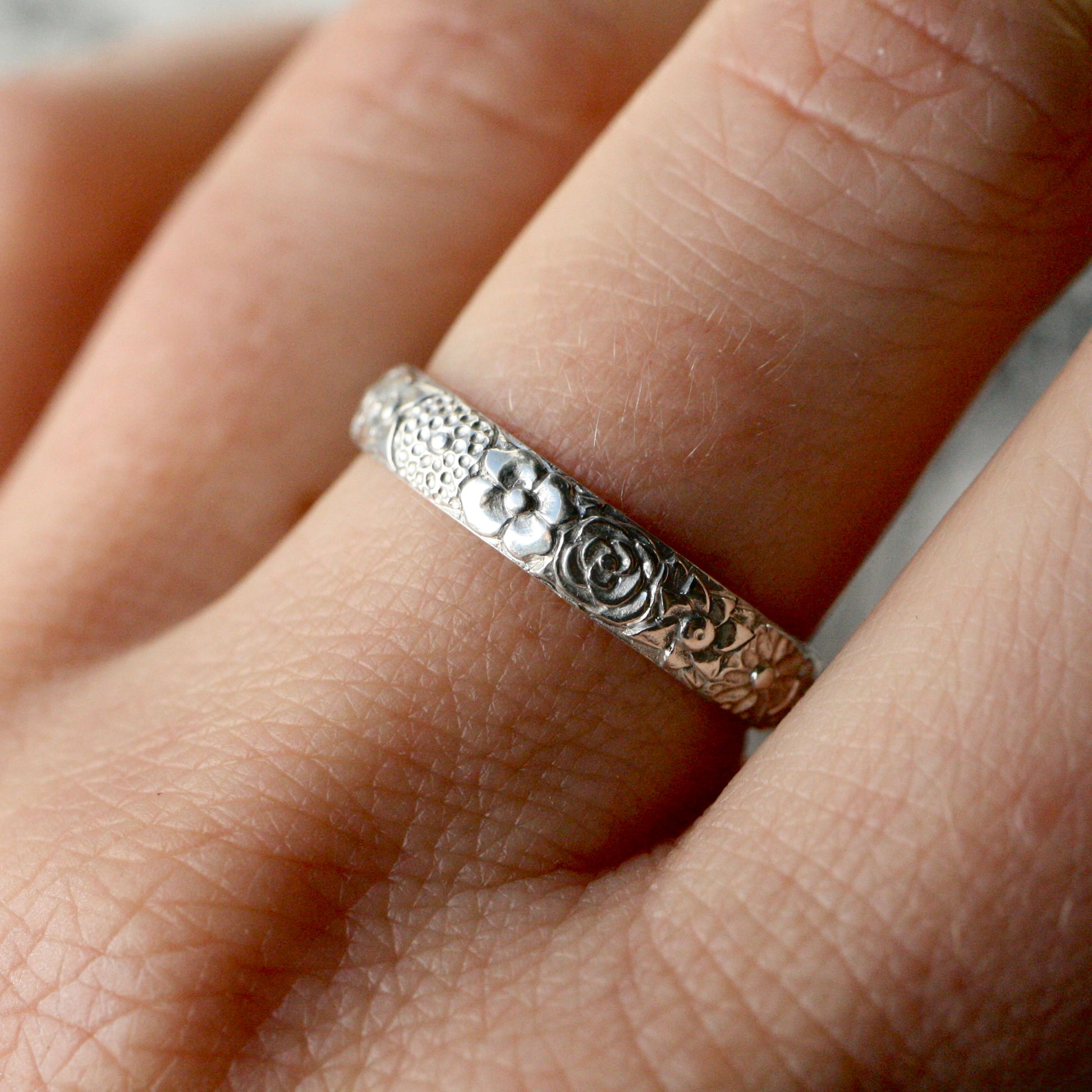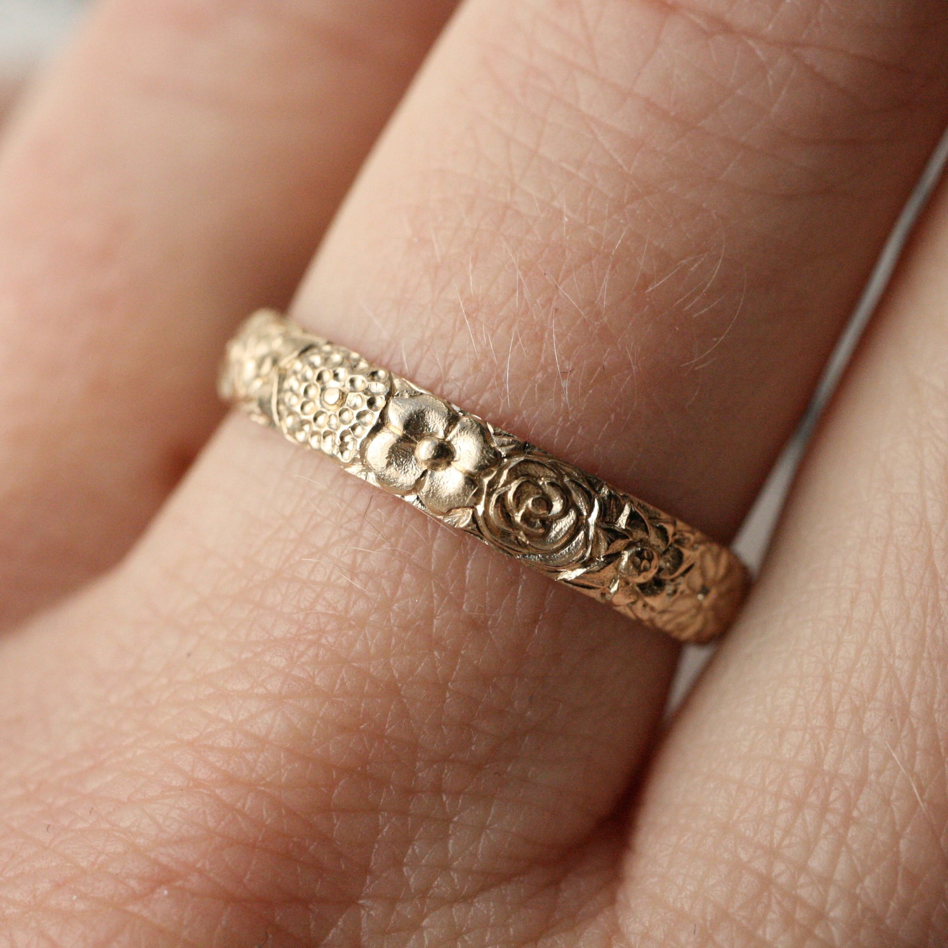 Named after one of my favorite childhood movies, the secret garden band is dainty yet elaborately decorated with a variety of flowers. Simple yet sure to stand out and easily stackable. 3.5mm wide, made to order in solid sterling silver or 14k gold with hand engraved details.