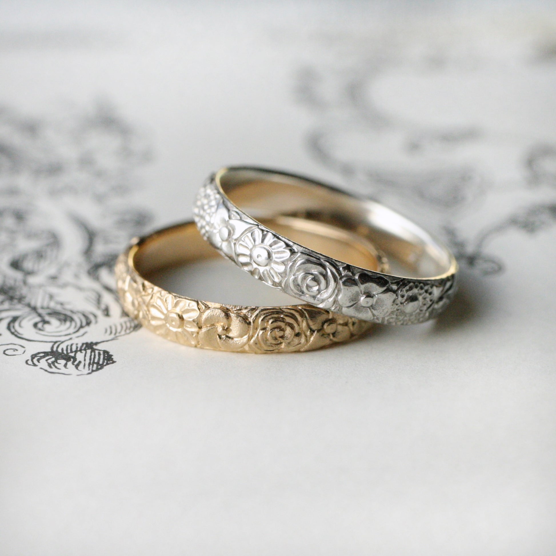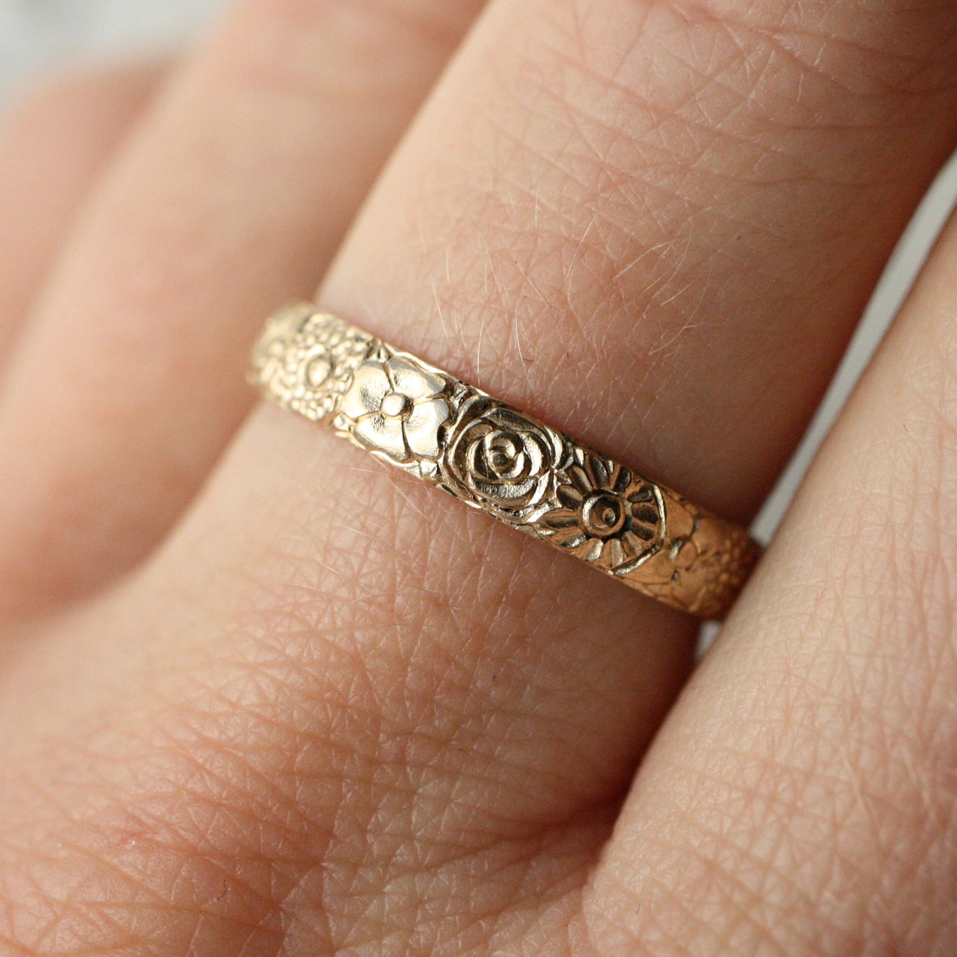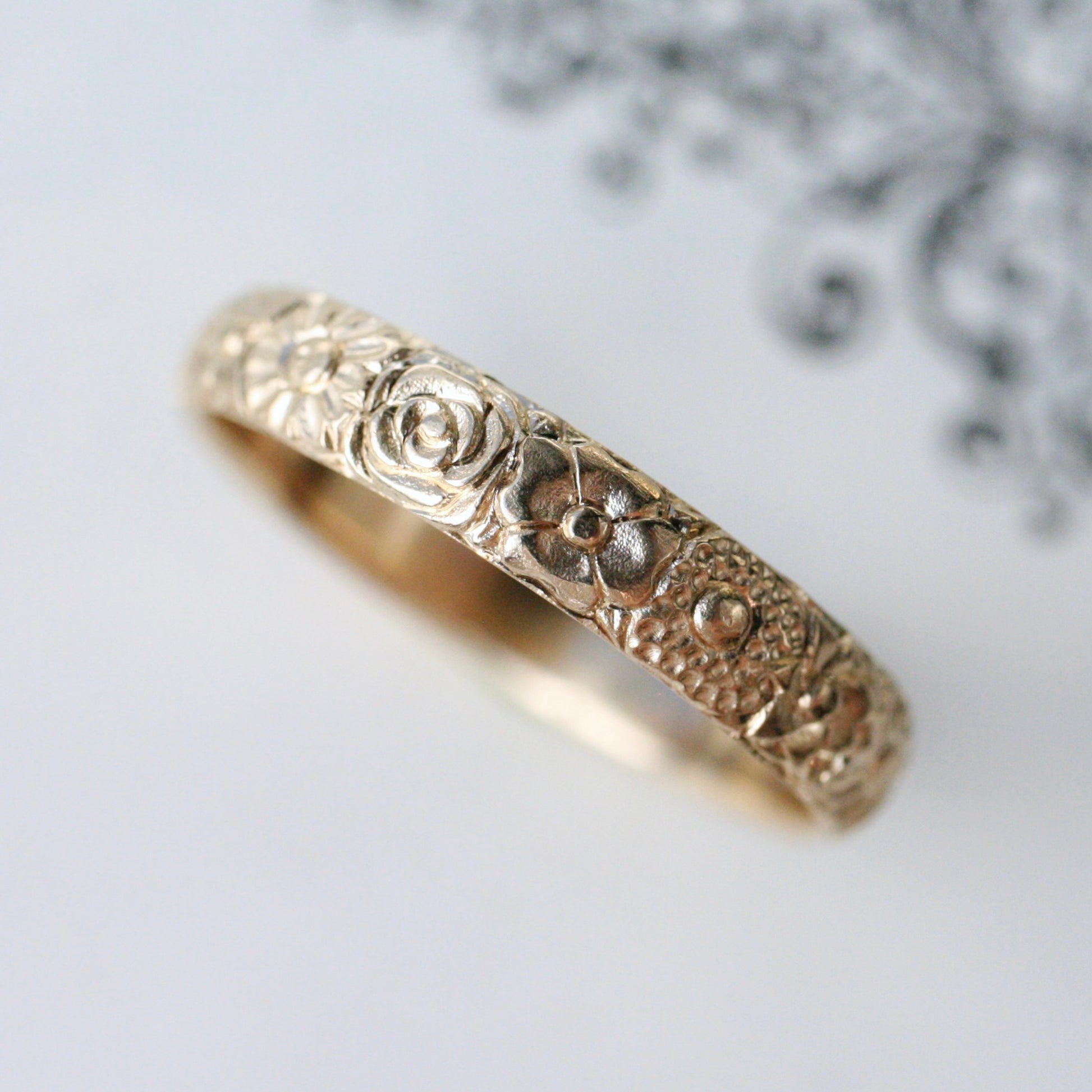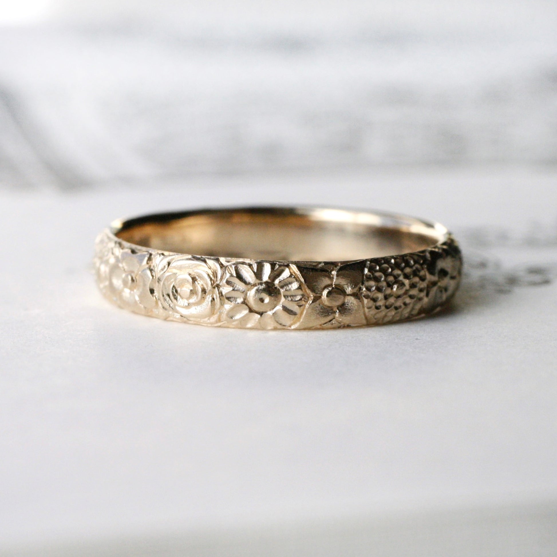 Named after one of my favorite childhood movies, the secret garden band is dainty yet elaborately decorated with a variety of flowers. Simple yet sure to stand out and easily stackable. 3.5mm wide, made to order in solid sterling silver or 14k gold with hand engraved details.