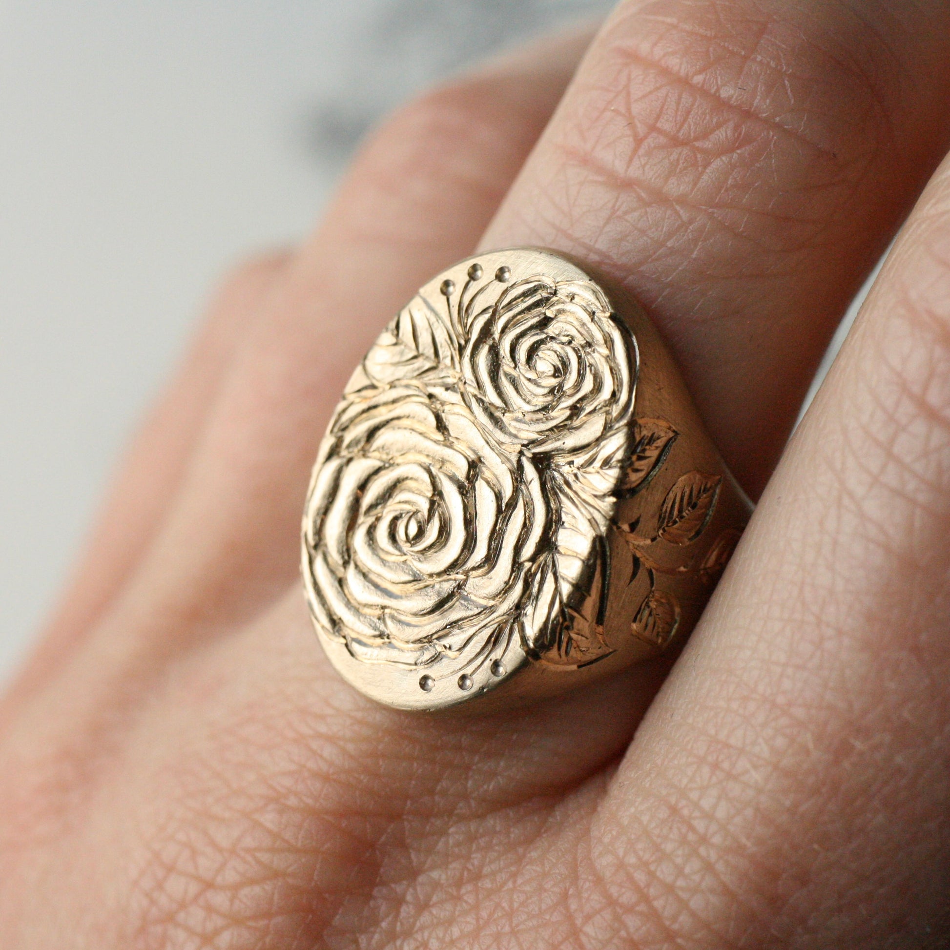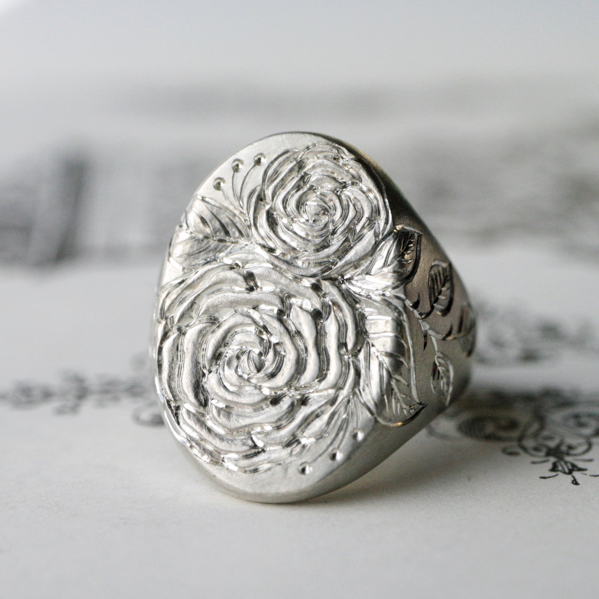This substantial, chunky ring is a feminine take on a classic signet ring shape. The face measures 16mm wide by 22mm tall. Made to order in solid sterling silver or 14k gold with hand engraved details.